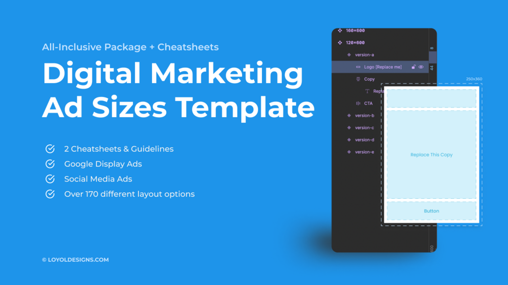 Save yourself time with our all-inclusive ad size cheatsheet for both Google Ads and Social Media Ads, along with 170+ different size layouts for you to choose from all within our Figma file!